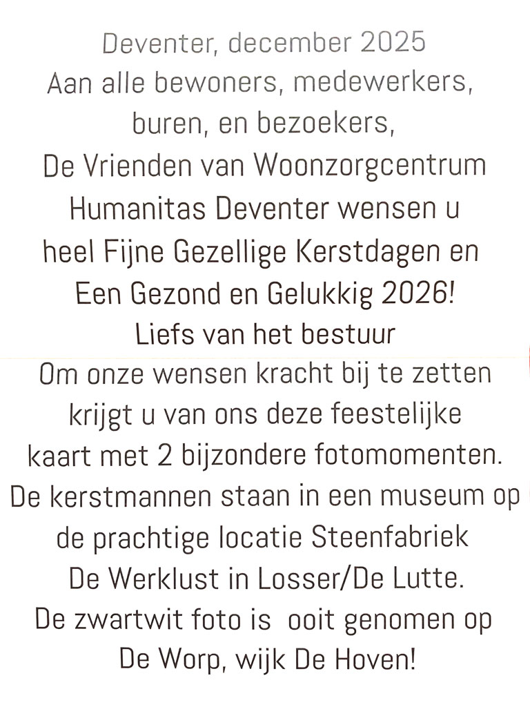 Wat 2026 brengen moge is natuurlijk zoals ieder jaar grotendeels maar afwachten. Er zal vast het een en ander veranderen, ook voor de stichting Vrienden van ons dierbare Woon- en zorgcentrum Humanitas Deventer. Houd ons dus in de gaten via deze website.
